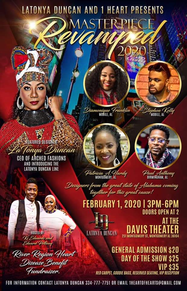 A fundraising fashion show is coming to the Davis Theatre in Montgomery Feb. 1, that will benefit people with heart issues and help them pay for treatment. Masterpiece Revamped 2020 will be held from 3-6 p.m. Tickets are available, and can be obtained by contacting the organization on their Facebook page at https://www.facebook.com/1heartofhearts/