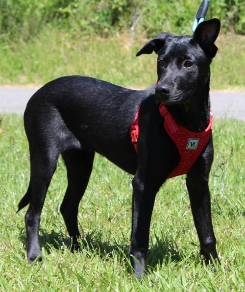Zoe is a 5-month-old female Black Lab mix. She came to PAHS as an owner turn in because the other dog in her family was not doing well with Zoe. Zoe is black with white markings; doesn’t she look adorable with her red harness? We love the one ear up–one ear down look! We think it gives Zoe character–not that she needs any because she is a character! She weighs 30 pounds and will be a medium sized adult dog. Zoe is smart! She is already both leash trained and house trained according to her previous owner. Zoe prances like a show pony when walking on a leash! Her owner shared she has been an indoor dog and prefers being inside. Zoe is absolutely great with children and other dogs. This is such a nice dog who deserves a new loving family and a totally awesome home! Please consider making Zoe your new best friend!