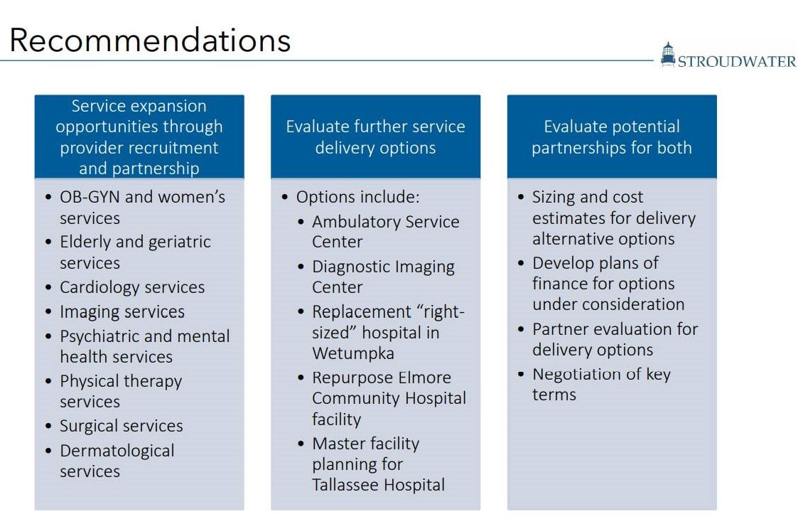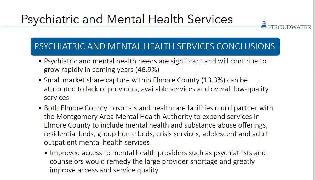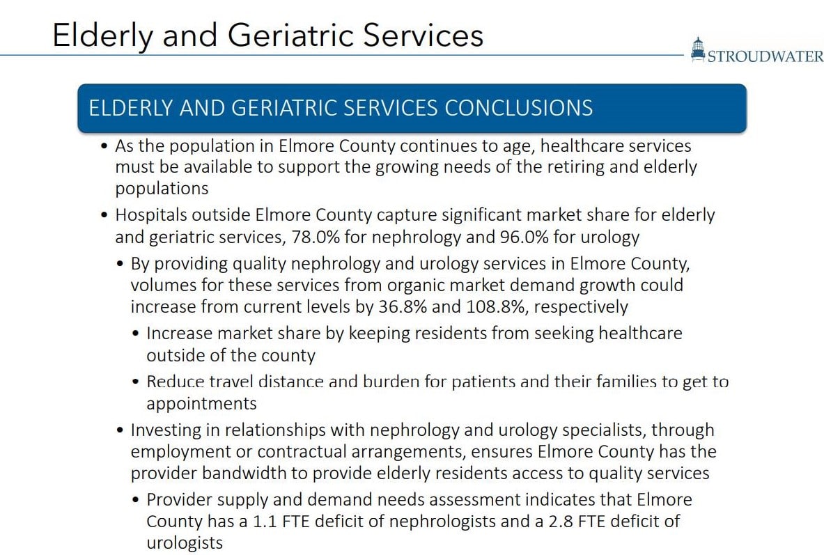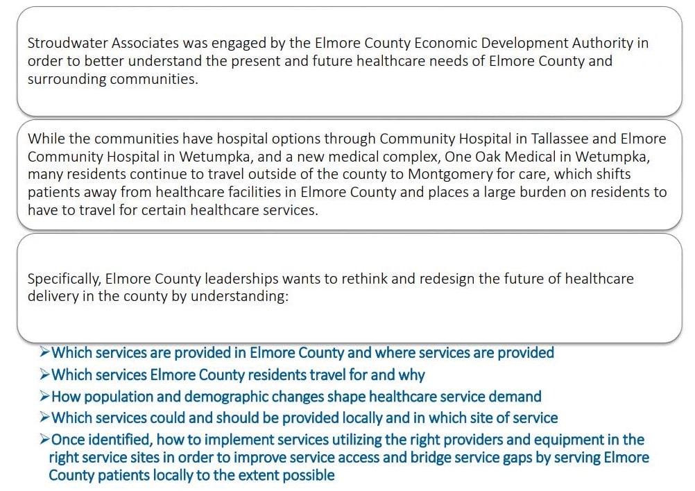 WETUMPKA, ALABAMA – The Elmore County Economic Development Authority (ECEDA) in conjunction with the Elmore County Commission engaged Stroudwater Associates to better understand the present and future healthcare needs of Elmore County. The goal of the study was to determine what services are currently provided, what services and where residents travel for services, determine future healthcare needs, and identify services that could and should be provided locally. Stroudwater Associates presented their findings today to local stakeholders including many elected officials, first responders, and healthcare professionals.