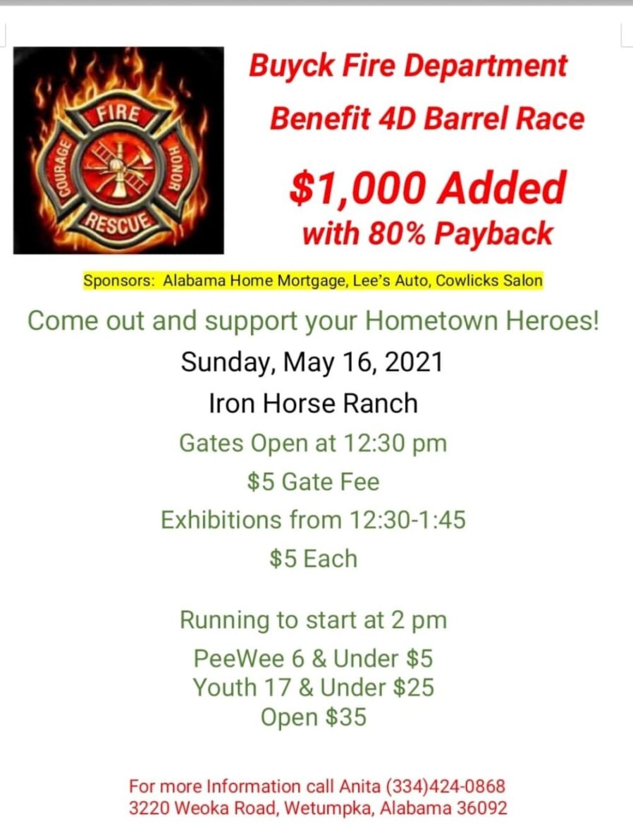 The Buyck Fire Department Benefit 4D Barrel Race is sponsored by Alabama Home Mortgage, Lee’s auto and Cowlicks Salon.