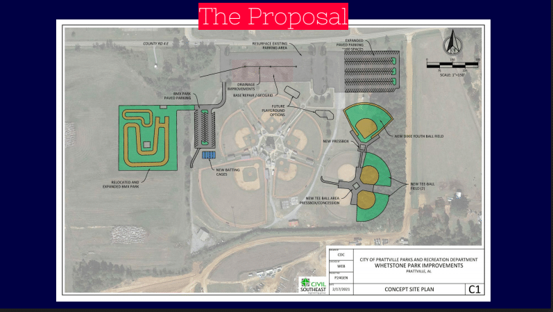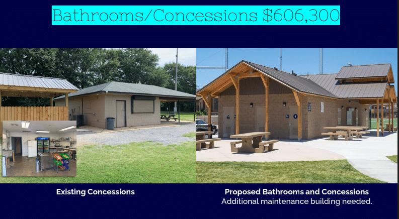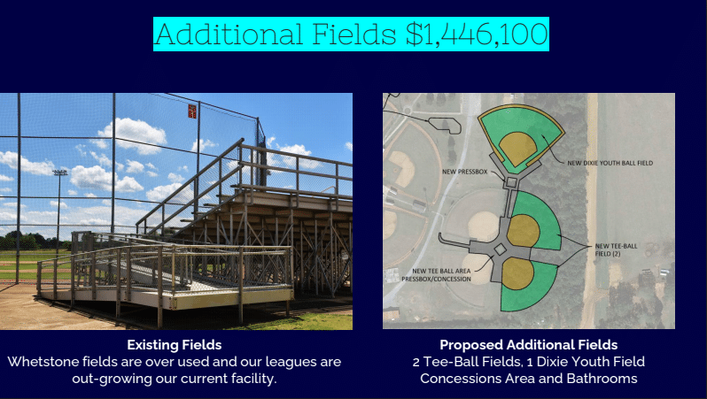 “Our overall proposal for whetstone would address drainage improvements, existing parking area issues, and would include a new press box, concession stand, tee-ball area, and dixie youth baseball field,” Cook said.