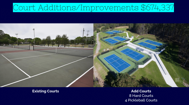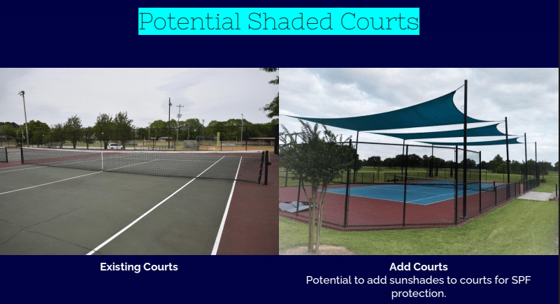 The proposed plan would add eight new hard courts and four pickleball courts, as well as shade for each court for SPF protection. Additional bathrooms would also be built, and parking and walking trail improvements would be met.