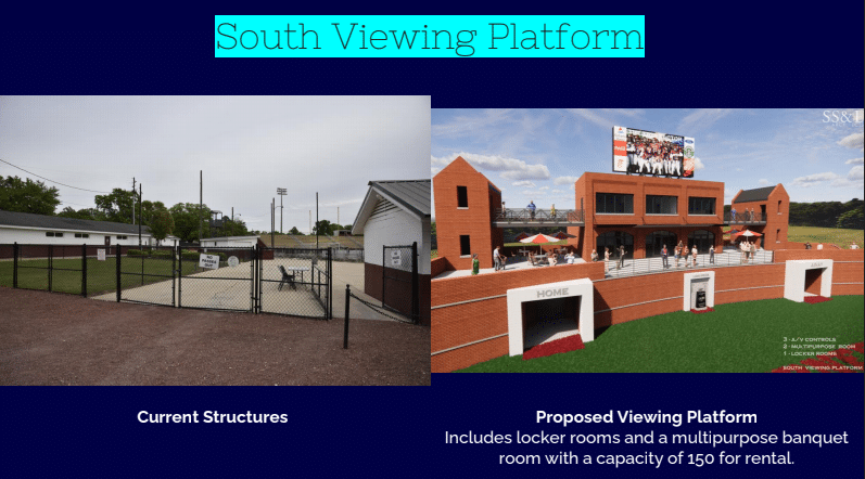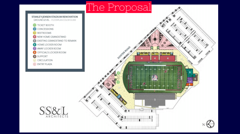 The proposal would make the current home side the guest/visitor side and would include a grandstand with a press box and booster box. There would be a proposed viewing platform that includes locker rooms and a multi-purpose banquet room with a capacity of 150 people. There would also be improvements to restrooms, ticket areas, and concessions. The proposal showed a dedicated park area, a new entry plaza, and official locker rooms.