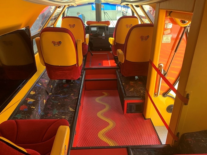 Flash forward to 2021, and the exterior design of the mobile still resembles the original from over 80 years ago. The interior of the vehicle has a low ceiling, but enough room to still adequately stand. Inside, there are six seats, including the diver and passenger, decked with a flat screen TV and drawers for storage. Perhaps the most notable feature of the wienermobile was the ceiling, which depicted clouds floating high in the sky.