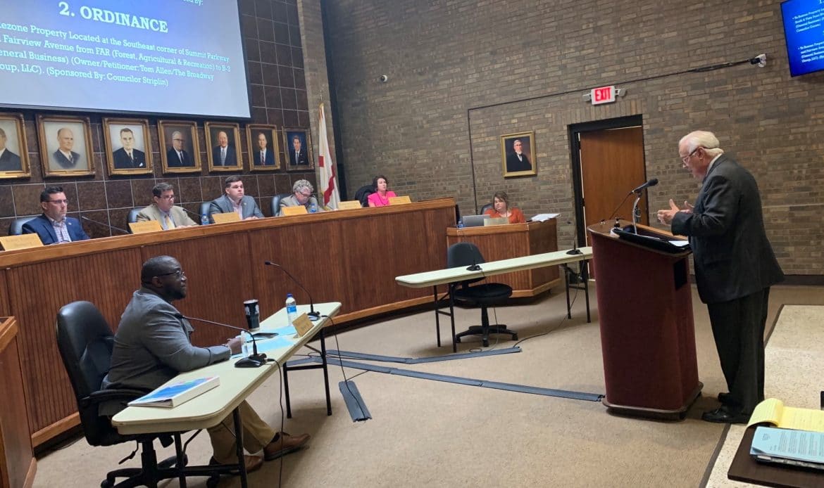 At the public hearing before the vote, Jim Edwards, Real Estate Lawyer for Balch and Bingham LLP, spoke on behalf of his clients BVCV. He expressed his concerns regarding the city’s plan to rezone the entire property to B-2.