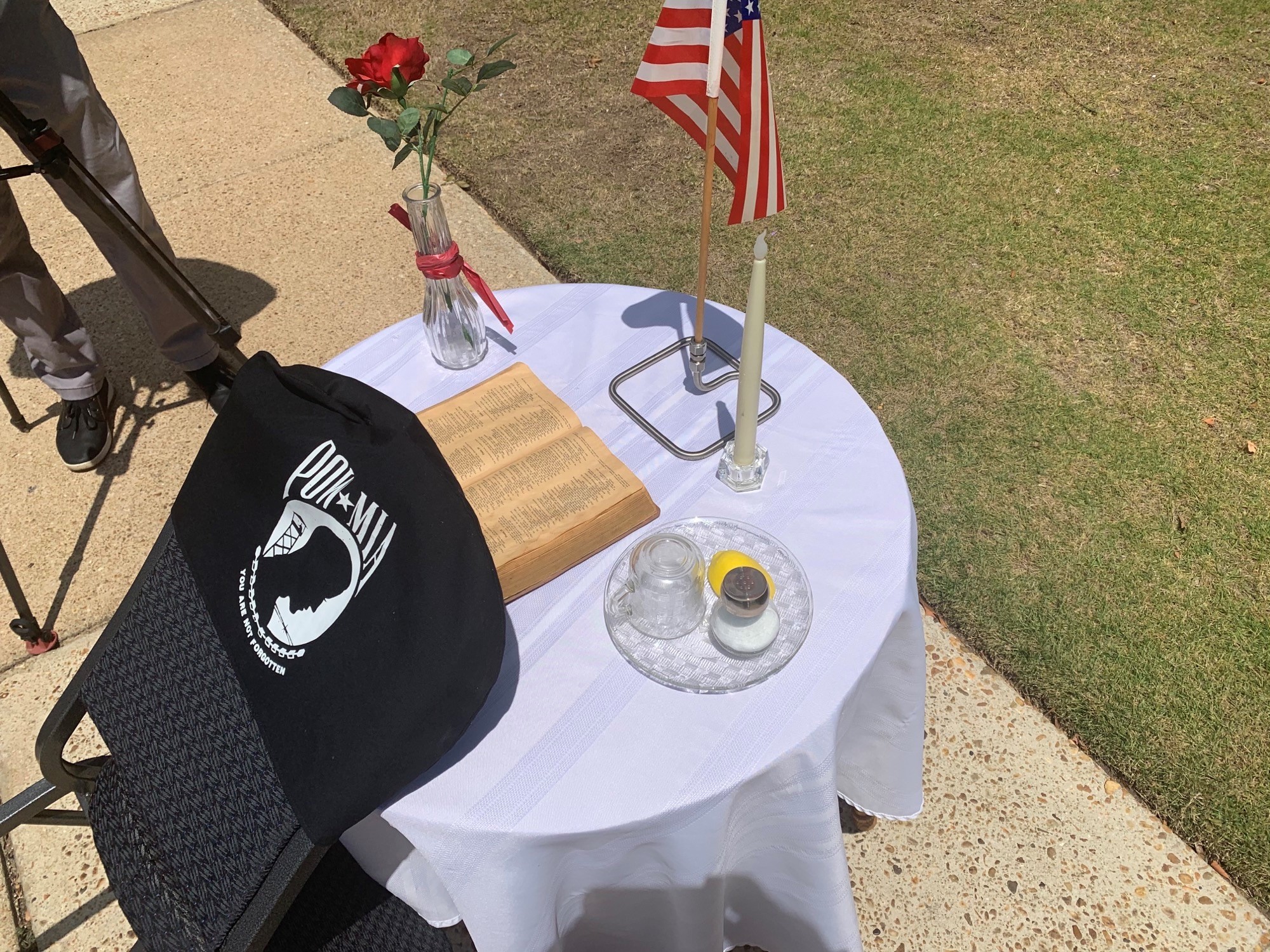 At a small, round table with an empty chair was an observance at the center of the event. It symbolized the members of the armed forces who are missing from their ranks – POW’s and MIA’s.