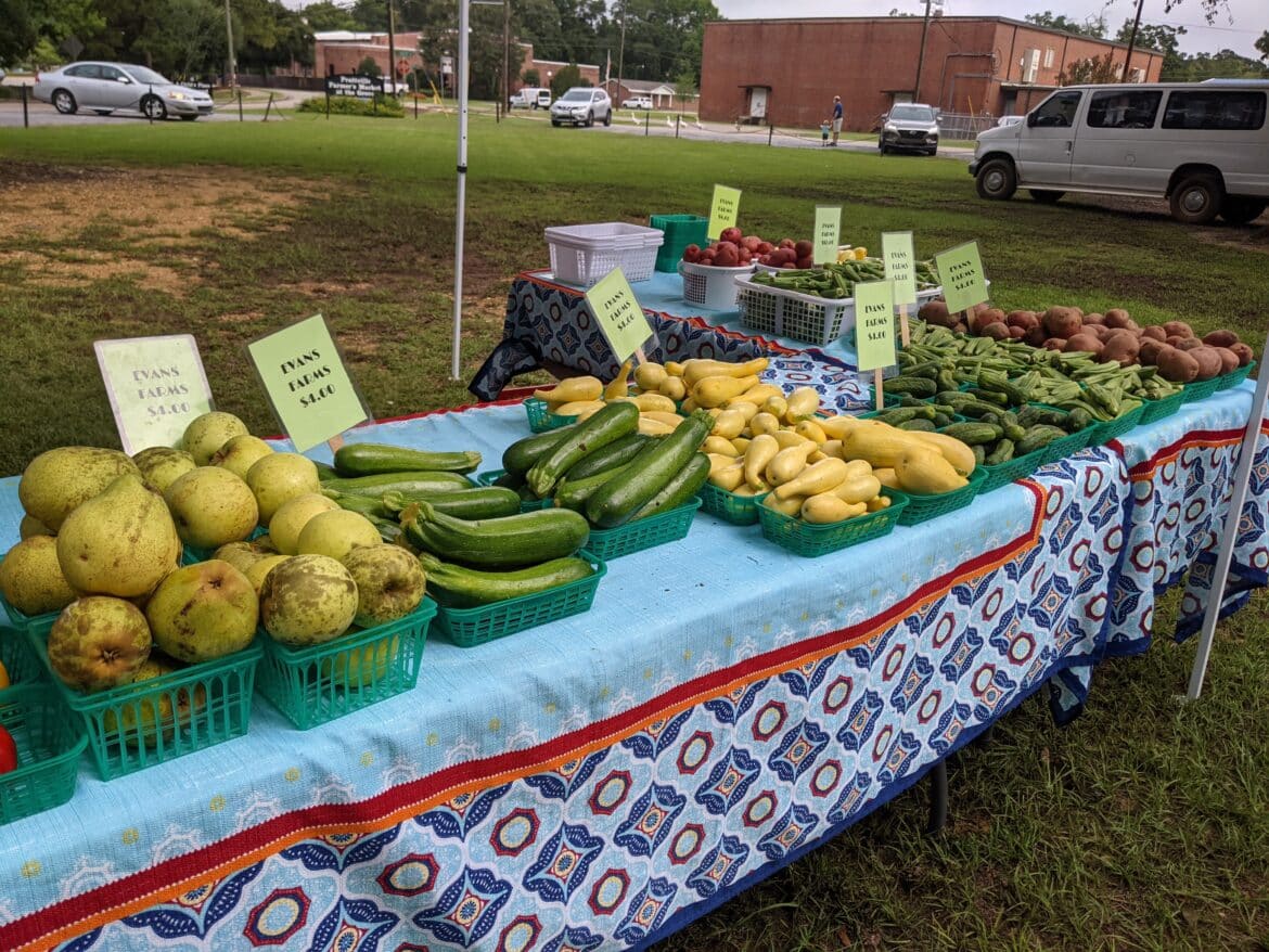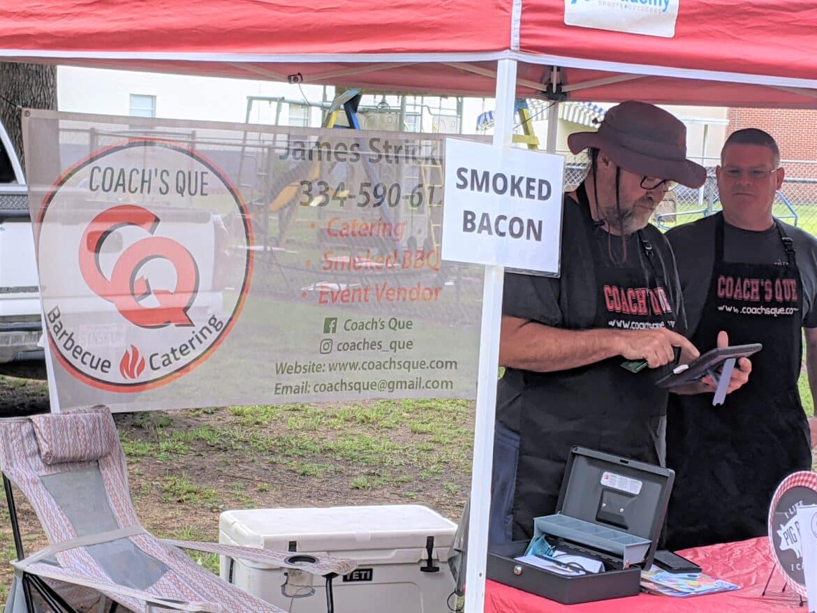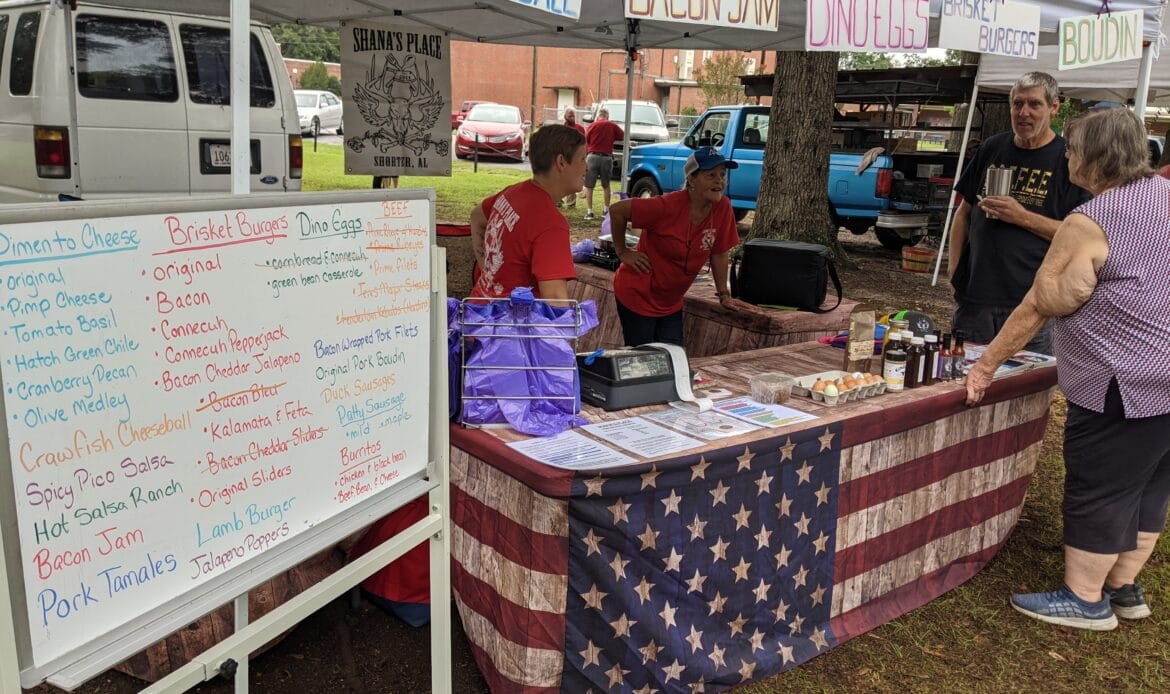 Other vendors at the market this morning included Evans Farms selling peaches, tomatoes, and squash, Shana’s Place from Shorter, AL selling bacon jam and brisket burgers, as well as Coach’s Que Barbeque and Catering selling smoked bacon and smoked bratwurst.