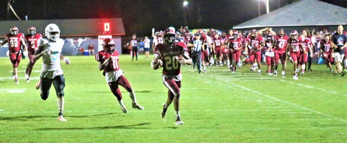 For the night, Junior Jacob Bryant started his first game behind center, and looked impressive early, completing his first four passes for 58 yards before the wet weather and rain. Bryant finished 6 – 14 for 82 yards. Trone rushed 22 times for 127 yards and 2 touchdowns. Thomas rushed 9 times for 71 yards and 2 touchdowns. Jackson Thomas led the Mustang receiving corp with 3 receptions for 36 yards.