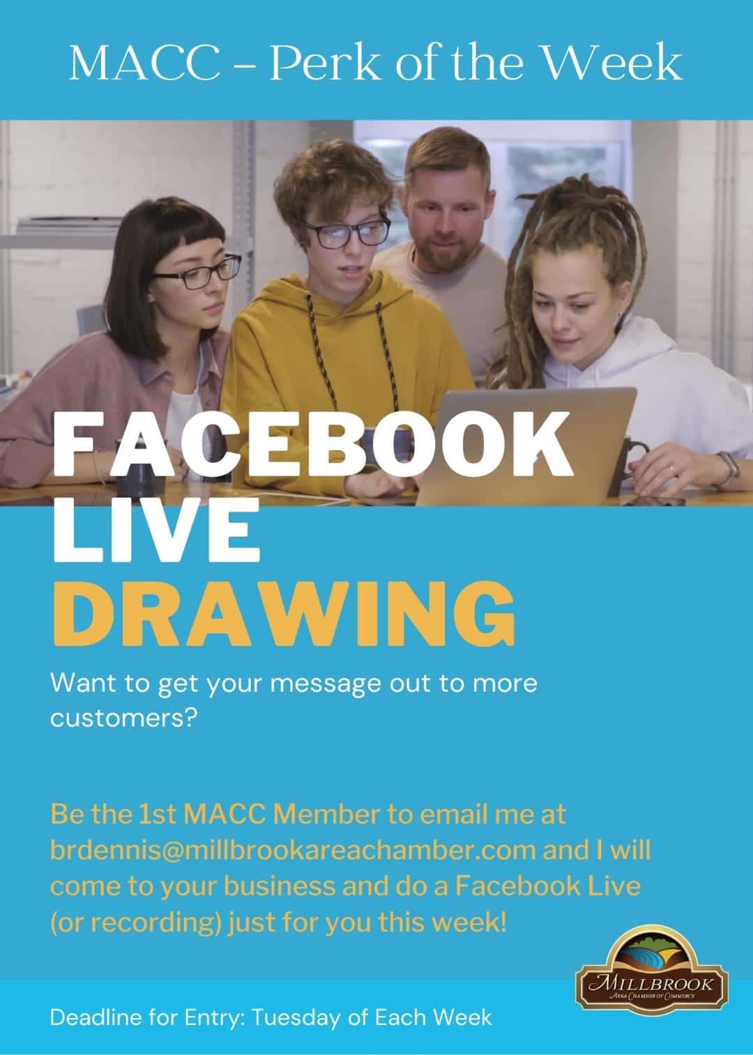 Well friends, the clouds have lifted, and it is a glorious time at the Millbrook Area Chamber of Commerce! Our Facebook page is back up and running and we will be launching a brand-new social media schedule soon that will enhance our coverage on Facebook, Twitter and Instagram, so stay tuned for more on that.