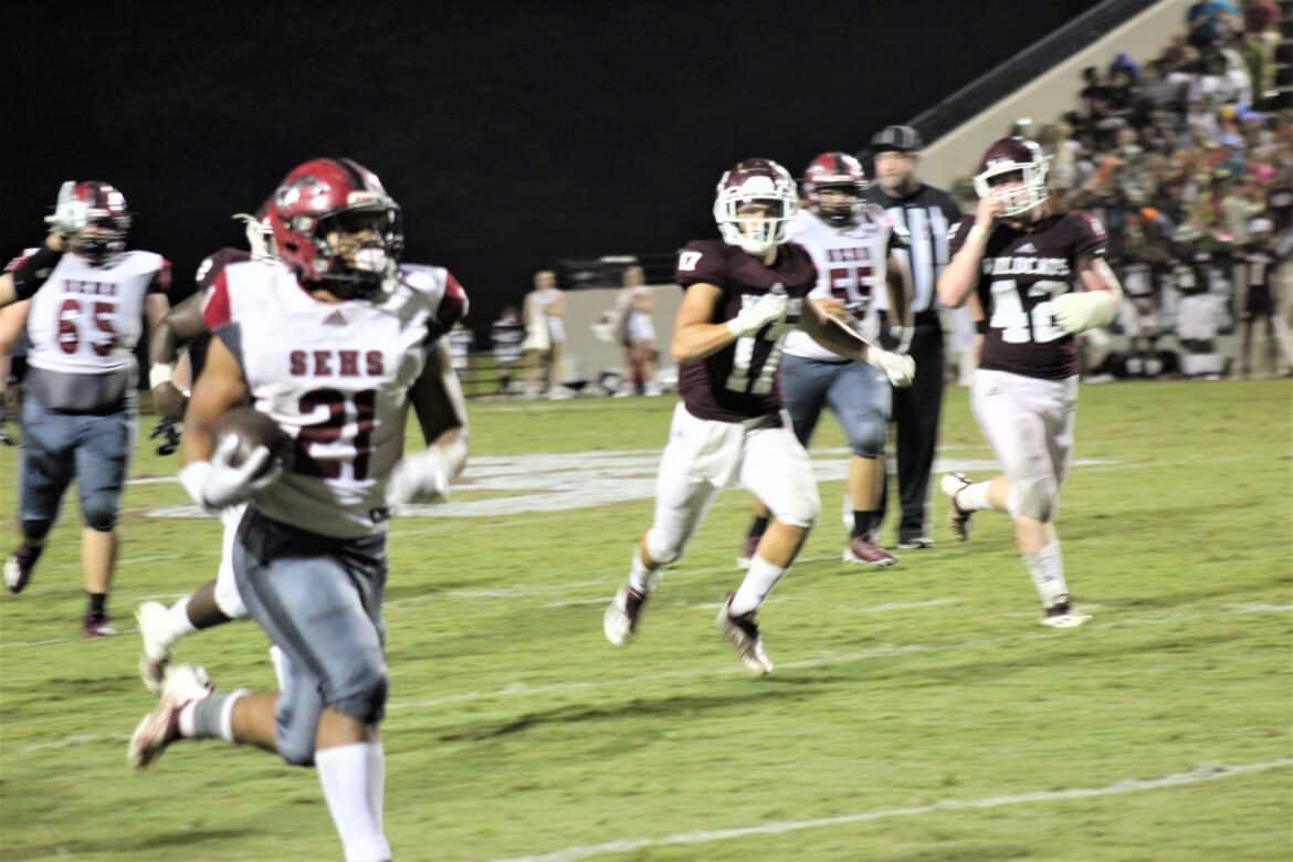 Trone had another impressive play in the 4th quarter, carrying defenders again for 21yards, before setting up his third score of the night to move SEHS ahead 35-14.