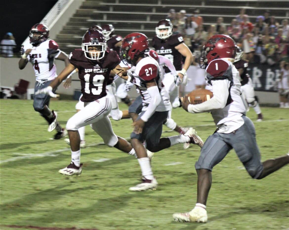 The Benjamin Russell Wildcats learned a hard lesson Friday night in the Class 6A Region 3 opener. The lesson was that Mustang Running Back Antonio Trone could not be taken down with an arm tackle. It took two, three, sometimes four defenders to take him down. The Stanhope Elmore High School offensive line dominated the line of scrimmage, ensuring that if the Wildcats did get multiple defenders to Trone, it was usually four or five yards down field at the earliest. The success of the offensive line was seen in the fact that the Mustangs rushed the ball 32 times on the night, and only had one play for negative yards. And it wasn’t just the rushing attack, SEHS quarterback Jacob Bryant was sharp, going 9-11 for 110 yards, 3 touchdowns and 1 interception, helping the Mustangs pull away late for a 42-20 victory.