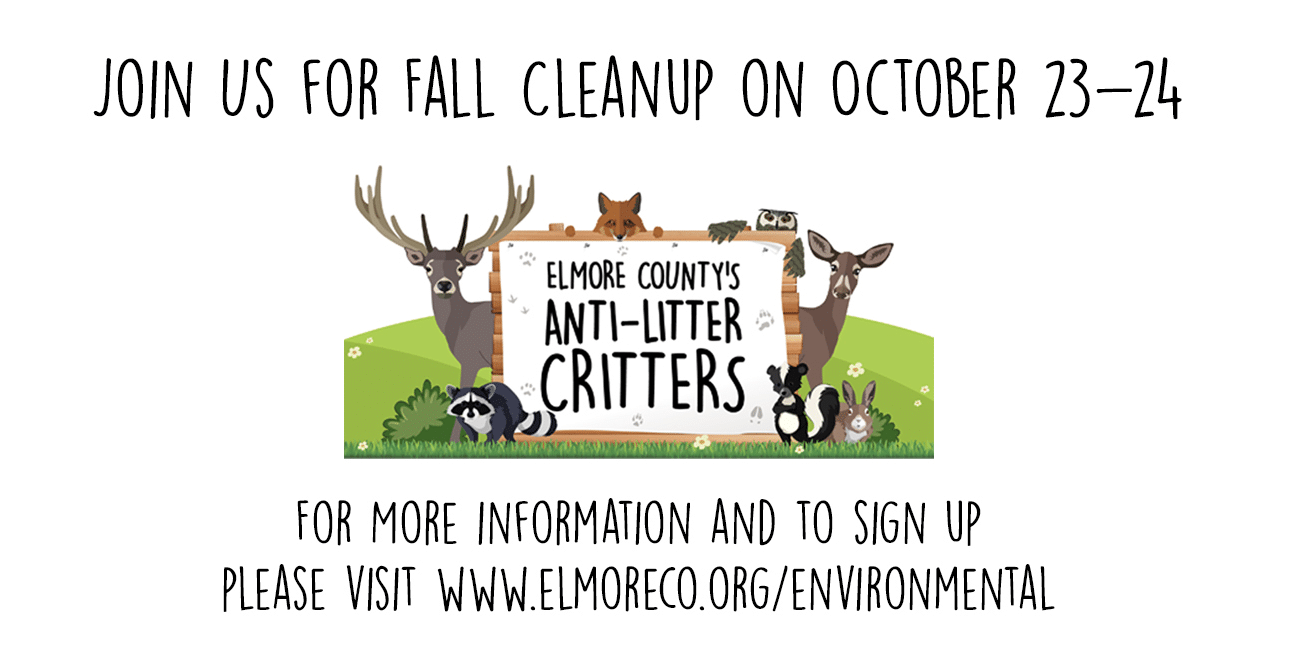 The Elmore County Commission will host a Fall Cleanup on October 23-24, 2021. With the amount of litter on the road sides, the County Commission is hosting this Fall Cleanup ahead of the typical Spring Cleanup, which will take place in early 2022.