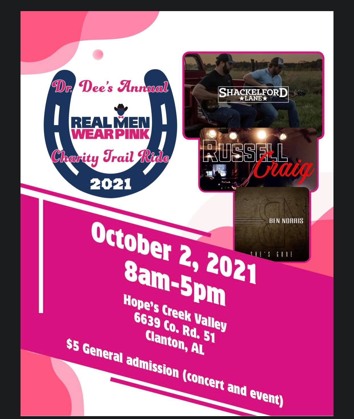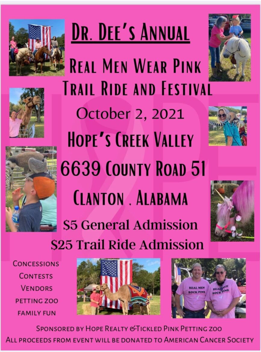 Alabama’s Public Health Veterinarian Dee Jones has something planned for every age at this year’s Real Men Wear Pink charity event on October 2, 2021 at Hope’s Creek Valley in Clanton. There will be children’s activities, live music, food and arts and crafts vendors, trail rides and a petting zoo.