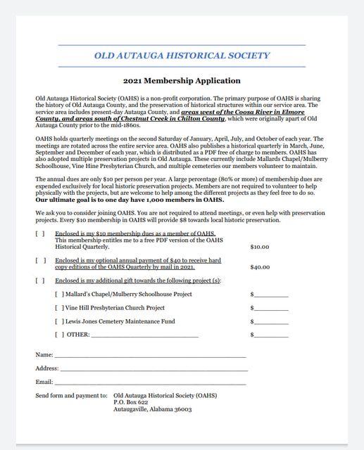 Old Autauga Historical Society is excited to report that applications submitted recently to the Alabama Historical Commission for old MULBERRY Schoolhouse and VINE HILL Presbyterian Church have been APPROVED. Both structures are being added to the Alabama Register of Landmarks & Heritage. This is the third addition from Autauga County (OAHS) in 2021!