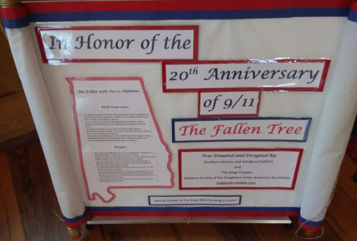 We had dinner last week at Fat Boy’s BBQ near downtown Prattville. It has one of the nicest trees I have ever seen. Fallen Tree is to honor those with Alabama ties and all those who lost their life in the attack on the United States on Sept 11, 20 years ago. It was designed and placed by the Alabama Society of the Daughters of the American Revolution.