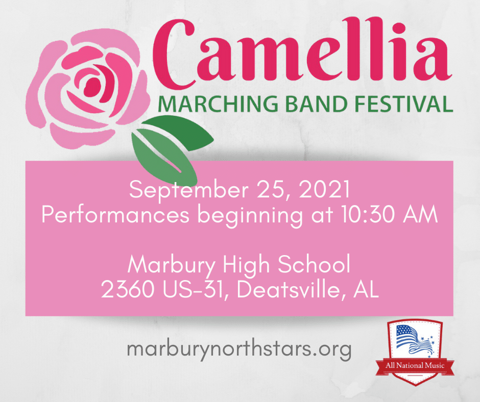 “We’re looking forward to September 25th as Marbury High School hosts it’s Inaugural Camellia Marching Band Festival!” says Marbury’s Band Director Brett Johnson. “We’re excited about this year’s awesome lineup! If you’re in the area feel free to swing by to check out some of these fantastic local Marching Bands.”