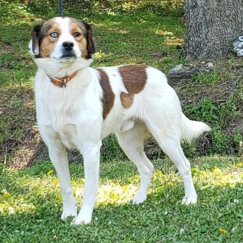 Ziggy is a two-year old, male, 40 lb Heeler/Spaniel looking mix. Very handsome boy with one bright blue eye. He can be a bit shy at first but once comfortable with you loves attention and is a very sweet boy indeed! Ziggy is not a high energy boy, good with other dogs, but not so much with cats. He has completed his treatment for heartworms so is now ready to be adopted!