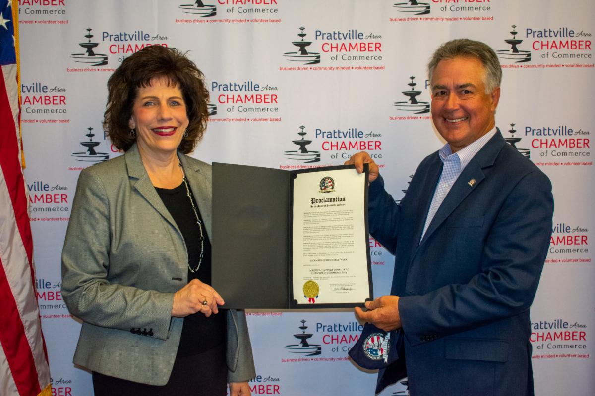 Bill Gillespie, Jr., Mayor of the City of Prattville, presents the proclamation for Chamber of Commerce Week to Prattville Chamber President Patty VanderWal.