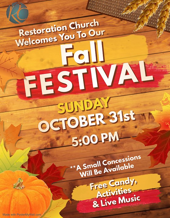 SUNDAY, OCTOBER 31 – 5 P.M. – RESTORATION CHURCH FALL FESTIVAL
