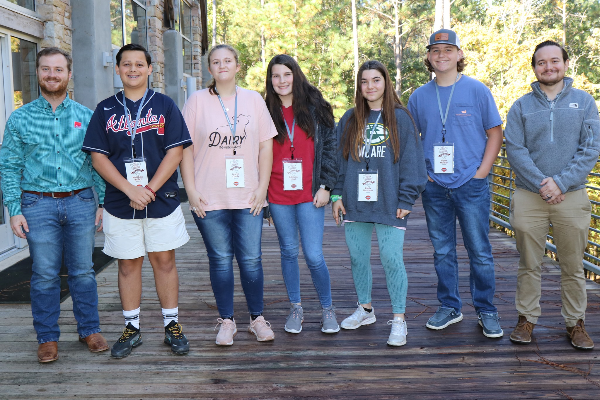 Autauga County students Kayden Bland, Hannah Starnes, Mason Dunaway, Caydin Green, Jake Robbins and Baylor Stange attended the Alfa Youth Leadership Conference Nov. 1-2 at the Alabama 4-H Center in Columbiana. The conference for 9th and 10th grade students teaches them how to advocate for agriculture, identify their potential and step into leadership roles. Sponsors are the Alabama Farmers Federation, Autauga County Farmers Federation and Alabama Farm Credit. Bland, Green and Stange are students at Billingsley High School, while Starnes, Dunaway and Robbins attend Autauga Academy. From left are Alabama Farmers Federation’s Hunter McBrayer, Bland, Dunaway, Green, Robbins, Stange, Starnes and Alabama Farm Credit’s Jacob Robertson.
