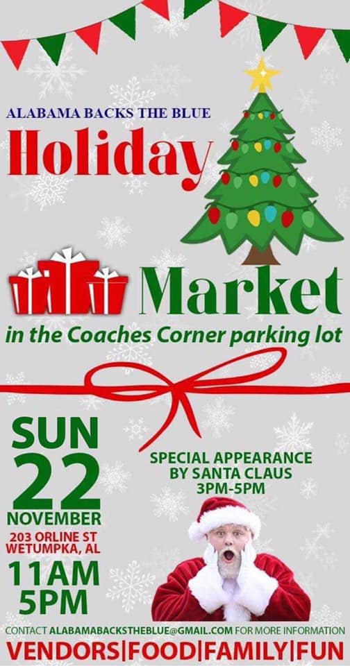 Alabama Backs the Blue will host a Holiday Market in the Coaches Corner Parking Lot in Wetumpka from 10 a.m. to 2 p.m.