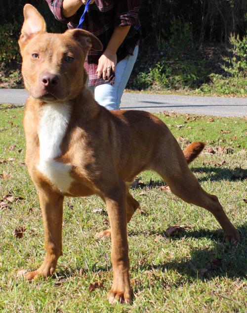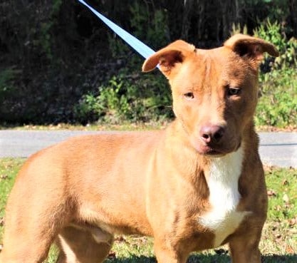 Buddy is a 9-month-old male Pit Bull mix who has already been neutered. He was brought to PAHS after he was found at a local park and his owner never came looking for him. Buddy is red and has a white chest. We love his ears! Sometimes they are both down but sometimes one is up! He weighs 33 pounds so he is considered to be a medium sized adult dog. Buddy is a good boy who would be fine with older children and other dogs. He is active, playful, and would need a nice fenced yard where he could safely play.
