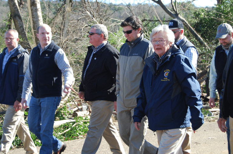 Top Photo: Governor Kay Ivey and state officials were on scene three years ago to see firsthand the damage to Wetumpka. Amazingly, there were no deaths, but the damage was severe. (Courtesy of Elmore County Commission)