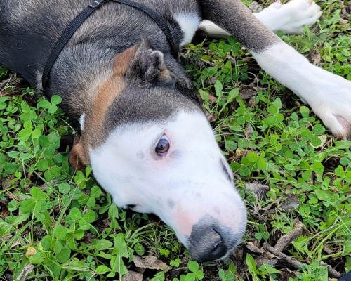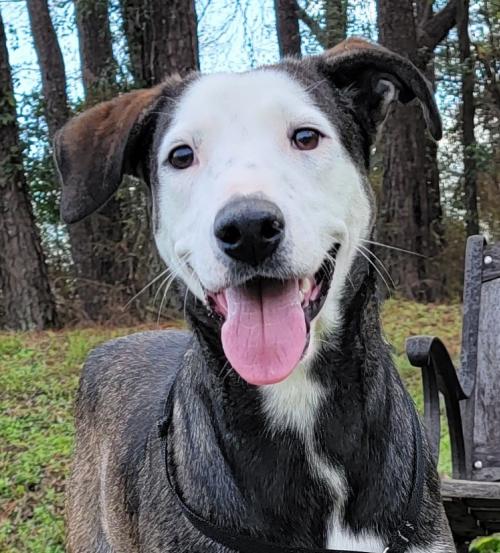 Hampton is a most unique looking boy, breed mix is really a mystery so just calling him a hound mix for lack of a better idea. He is a tall fella, about 9 months old, around 60 lbs. He was very shy at first but time and treats brought him around. Once he is comfortable with you he is super sweet. We have not yet checked with cats, he is good with his female kennel mate.