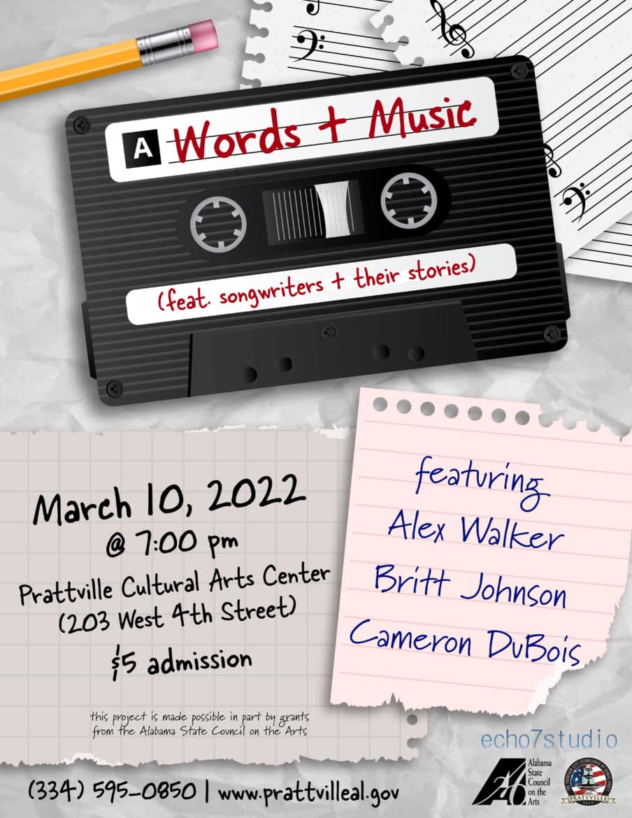 On March 10, the Prattville Creative and Performing Arts Council in partnership with echo7studio, will present Words and Music, an event featuring musician/songwriters Alex Walker, Britt Johnson, and Cameron DuBois. This annual event promotes talented River Region singer/songwriters.