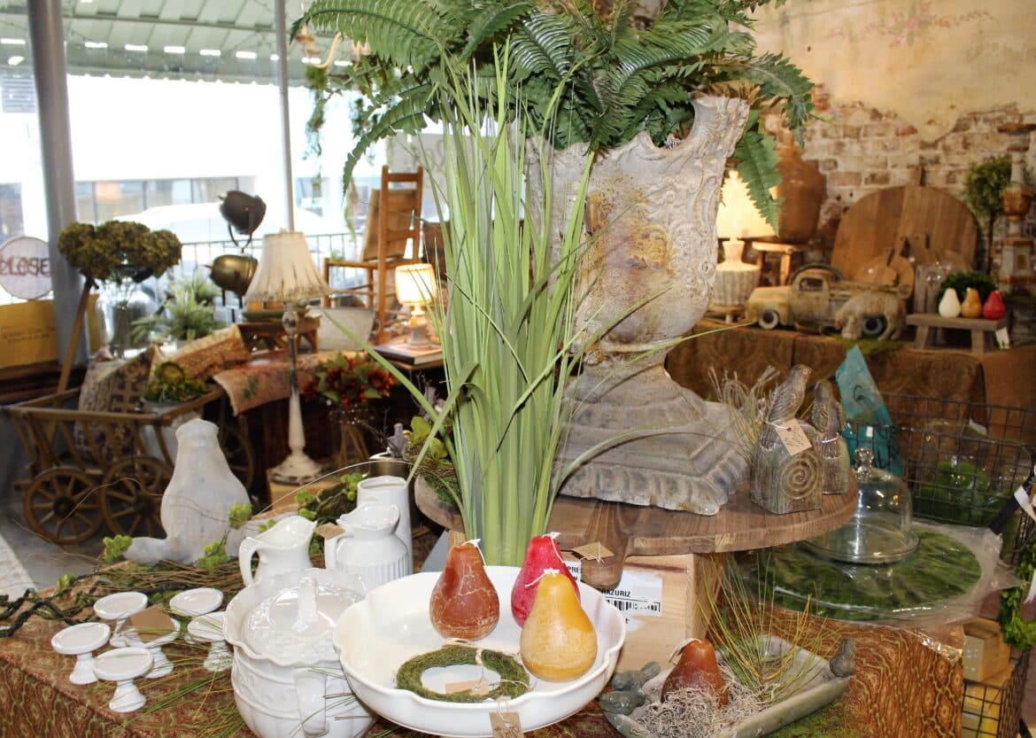 Custom window treatments can be created as well as custom bedding. Also available are pillows, cushions, slip covers, antique Turkish rugs, custom quilts, T-shirt quilts, and custom and edge-to-edge long-arm quilting. Her merchandise also includes a variety of silk greenery, textural botanicals and candlesticks.