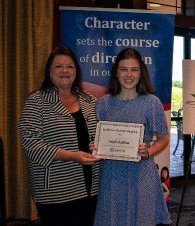 The two Excellence in Character Scholarships of $3,500 were awarded to graduating senior Amelia Robbins and post-secondary student Christian M. Walker.