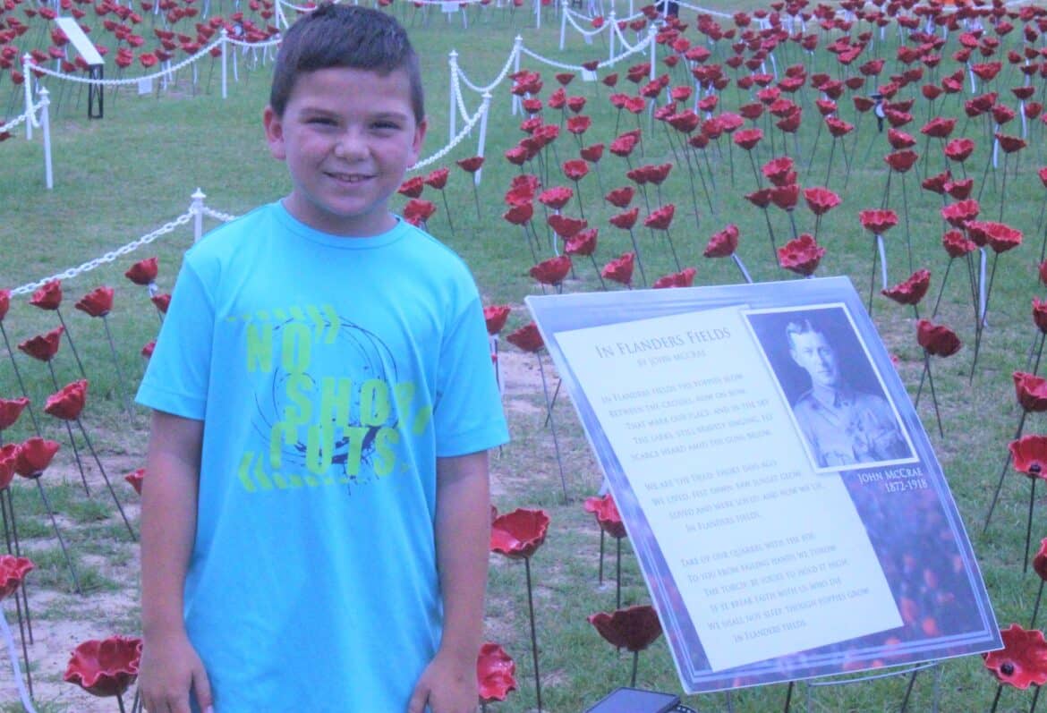 Featured in the field of poppies is the poem by John McCrae called In Flanders Field, which describes poppies blowing in the wind near the crosses on soldier’s graves.