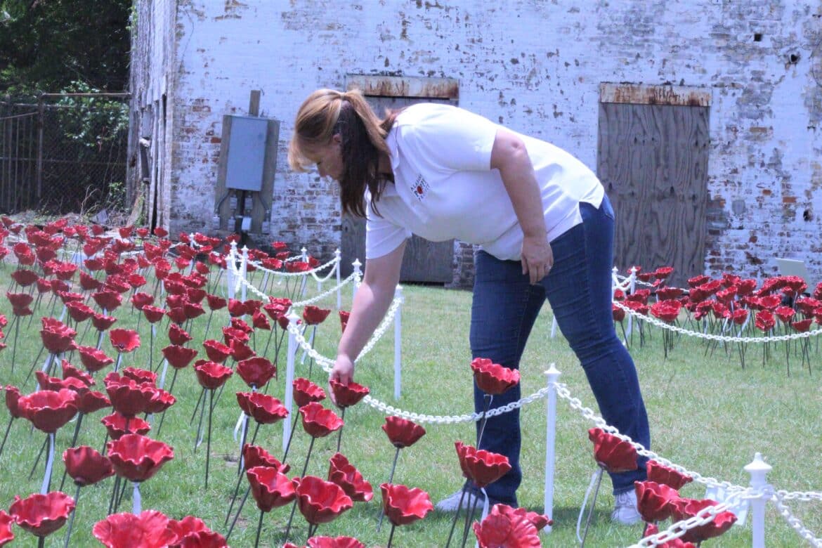 Julianne Hansen, who owns Hansen Fine Art and Pottery in downtown Prattville and who began the project, explained, “The Alabama Poppy Project was born out of the desire to keep myself busy around Memorial Day because after my stepson Kyle’s passing, it was too difficult for me to go to the cemetery for those ceremonies. Very raw, very fresh and very emotional and I had just to sit there and it was awful.”