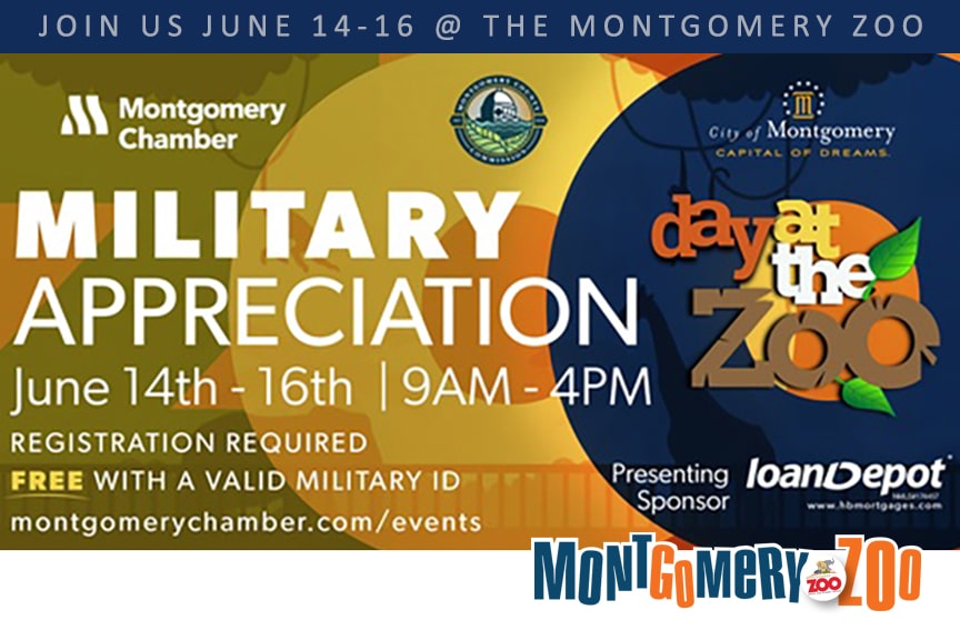 In conjunction with the Montgomery Area Chamber of Commerce and the City of Montgomery, the Montgomery Zoo is proud to salute all the men, women, and their families who courageously serve our nation in the armed forces. We invite all active duty and retired military personnel and their families to register to visit the Zoo for free admission on Military Appreciation Days June 14-16 from 9 a.m. to 4 p.m.