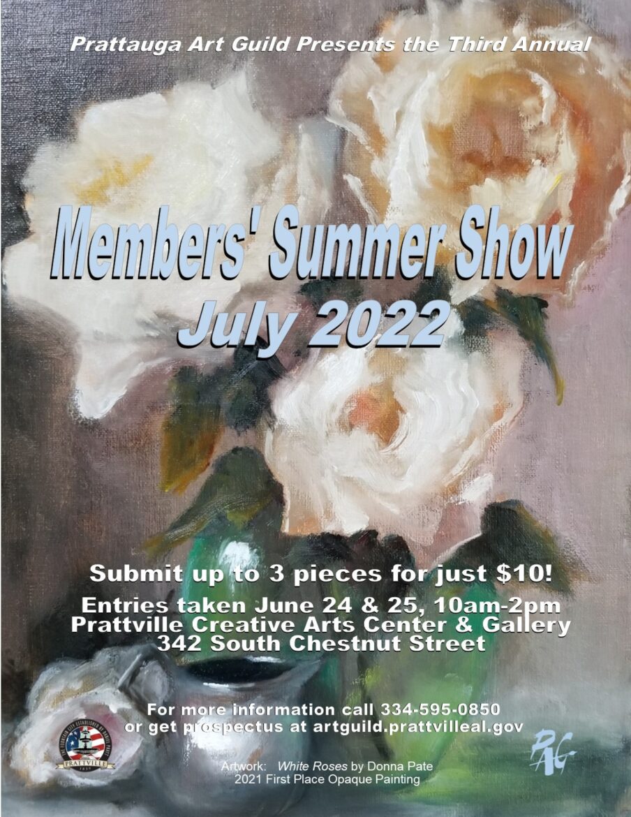 For more information about the PAG Summer Members’ Show or other PAG programs, contact the Cultural Arts Office at 334-595-0850 or visit artguild.prattvilleal.gov.