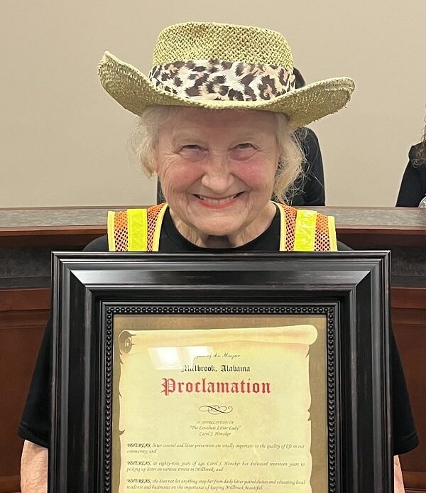The City of Millbrook is a tidier place because of Carol Honaker and her tireless efforts to keep our community litter free. A Millbrook resident and retired nurse, Mrs. Honaker, 89, was recognized at last night’s City Council meeting for her service to the community. Mayor Kelley presented Mrs. Honaker with a Proclamation extending Millbrook’s heartfelt appreciation for her almost daily routine of picking up litter along Main Street and her neighborhood and encouraging others to do the same. She has been successful in recruiting others to join her in the war against litter. Mayor Kelley noted, “on my way to work, I would often see this lady picking up trash along Main Street but was always in too much of a hurry to stop and formally thank her. Well one day, I made time. I pulled over, introduced myself and listened to her story. We are blessed with this individual.”