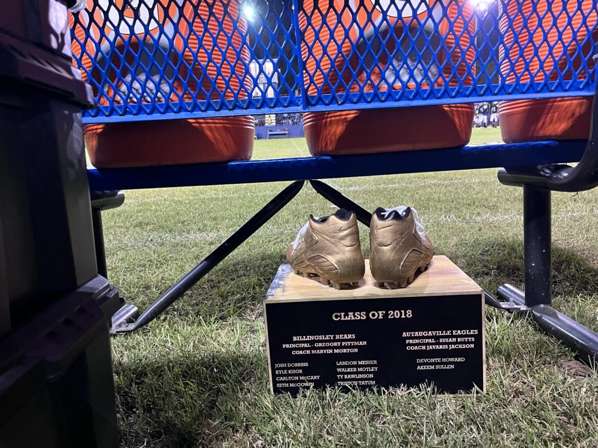 The “Golden Cleats” saga was created in 2018 to highlight the longstanding rivalry between Autaugaville and Billingsley football teams. The metallic gold pair of Nike Cleats atop the “Golden Cleats” trophy were worn in a 6A Championship Football game by a high school student whose family traces its roots to both the communities of Autaugaville. “They represent the XMAN commitment to support and reward excellence and achievement in rural communities” Berry said. At the half, Billingsley led Autaugaville 6-3, and then Autaugaville responded with a 46-0 run in the 2nd half.