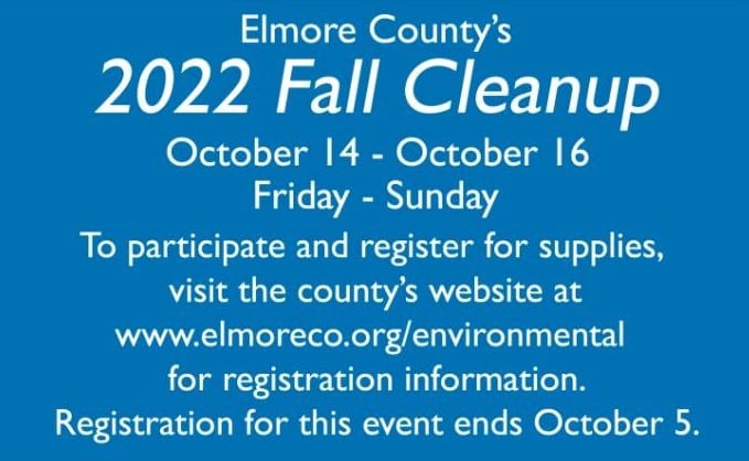 This is the last week to sign up for the 2022 Fall Cleanup. Individuals or groups willing to participate should visit the county’s website at www.elmoreco.org/environmental and submit a registration form. Once the form has been submitted, a county representative will respond with the information needed to complete the registration. The last day to register for this cleanup event is October 5th.