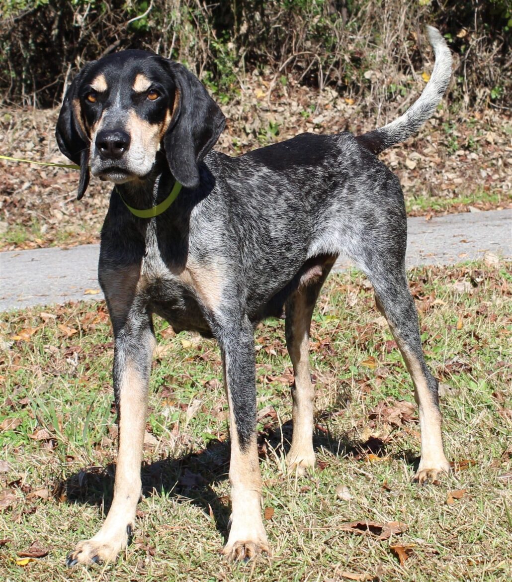 Taylor Swift is a 5-year-old female Bluetick Coonhound who has already been spayed. She came to PAHS as a stray who was brought in by Animal Control. Taylor Swift gets her “blue” coloring from black ticking on her white coat, which gives the impression of a navy blue color. This ticking covers her body and is interspersed with variously-shaped black spots on her back, ears and sides. She is a beautiful dog. Taylor Swift has had puppies but no puppies were found with her. She weighs 51 pounds and she is clearly underweight; we are working on putting some weight on her.