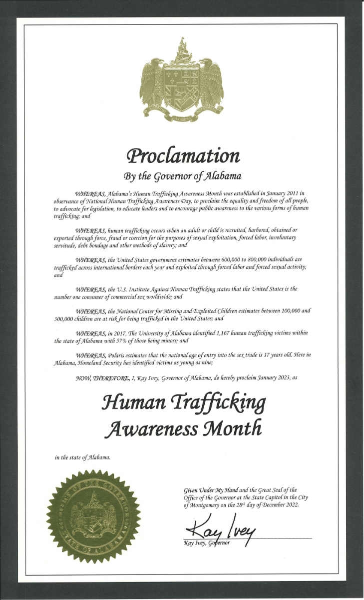 This week, Alabama Governor Kay Iven signed a proclamation recognizing January as National Human Trafficking Awareness Month. See Proclamation graphic for the actual document.
