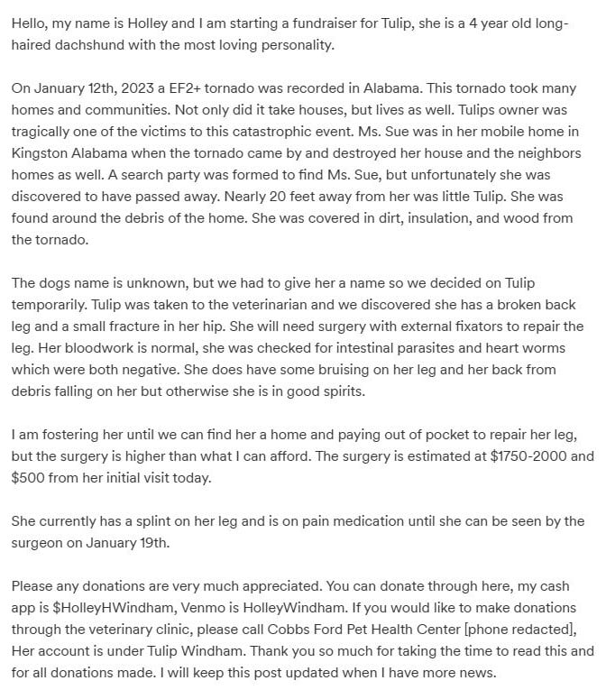 Tulip was the beloved pet of one of the fatalities from the Jan. 12 tornado. Tulip was found not far from her owner, who had perished. Tulip requires surgery to repair her extensive injuries she sustained. If you are interested in helping, please see the link below with a variety of ways to offer help.