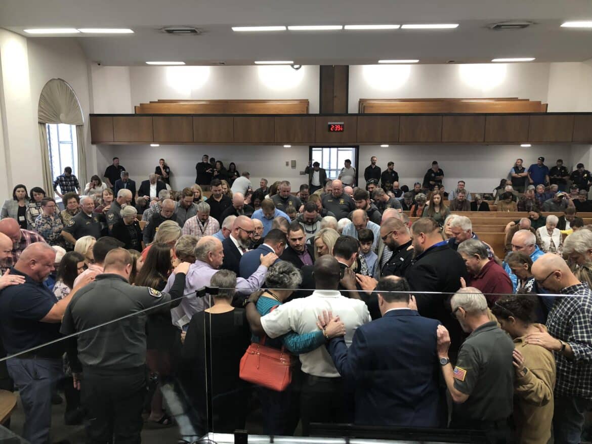 To close the ceremony, at Harrellโs request, all those in law enforcement were asked to come to the front of the courtroom for prayer. They encircled Harrell, many placing their hands on him, and began praying.