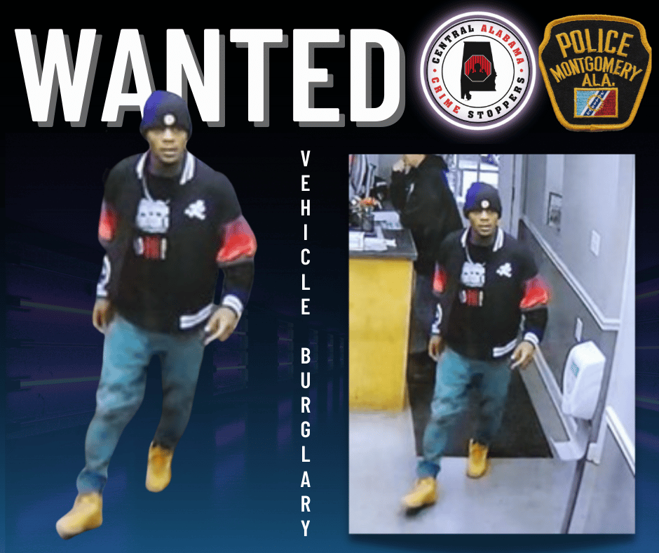 Montgomery Police Investigators released a photo of an unknown subject wanted for vehicle burglary. The offense occurred, Thursday, February 2, 2023, in the 2200 block of Forbes Drive, Montgomery, Alabama. Investigators say the suspects unlawfully entered a vehicle, rummaged through the vehicle, and left the scene. There is no additional information available for release at this time.
