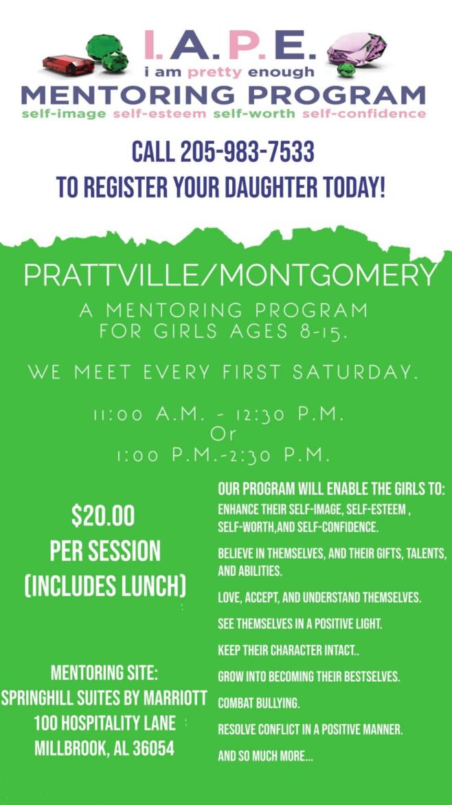 The I.A.P.E. (I Am Pretty Enough) Mentoring Program helps with self-image, self-esteem, self-worth and self-confidence.