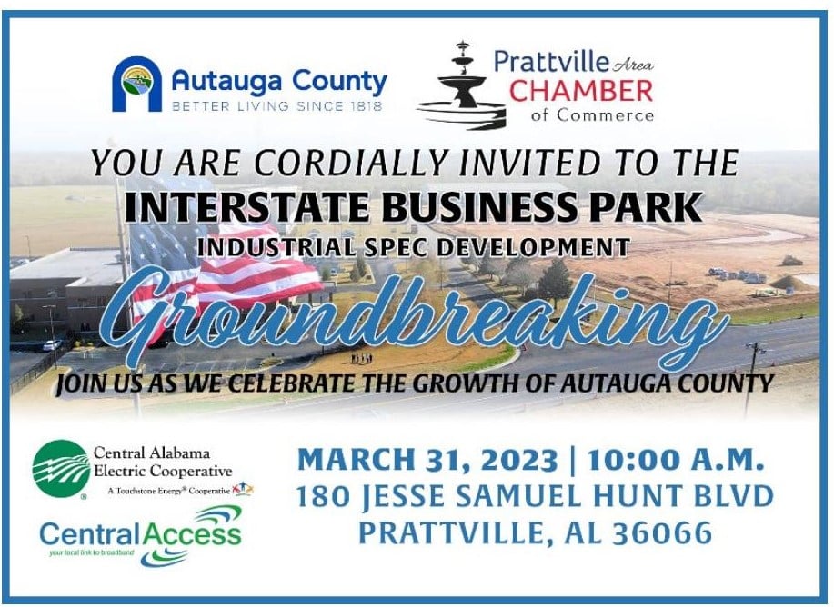 The Autauga County Industrial Development Board, the Autauga County Commission and the Prattville Area Chamber of Commerce invite you to attend a groundbreaking ceremony for the industrial spec development at the Interstate Business Park.
