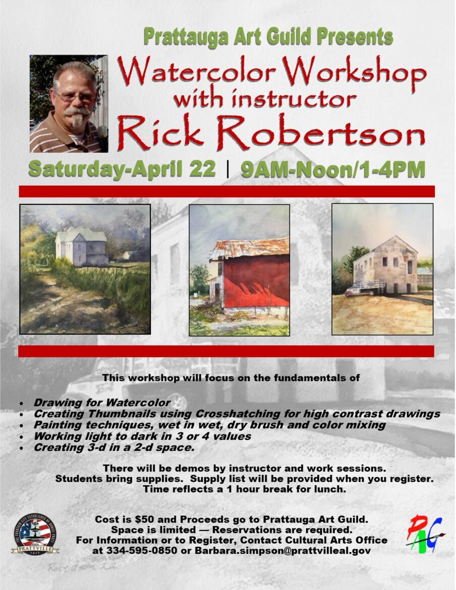 The Prattauga Art Guild is excited to announce a watercolor workshop with award-winning artist Rick Robertson. The workshop will be held Saturday, April 22, from 9:00 a.m. to 4:00 p.m. with a one-hour break for lunch.