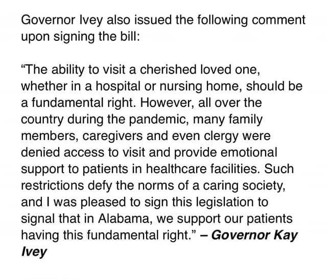 This law, which was inspired by Harold Sachs’ passing from Covid complications in 2020, aims to ensure that loved ones who are sick from an illness are not denied visits from a family member and do not pass away alone. Harold was the Grandfather of founder Emee Baldwin. Senator Robert’s wife, Anne, passed away in 2022, and he was not allowed into the hospital room. Representative Debbie Wood lost her mother during the covid pandemic and was not allowed to visit her before she passed away. This bill would protect a patients right to have a family member present.