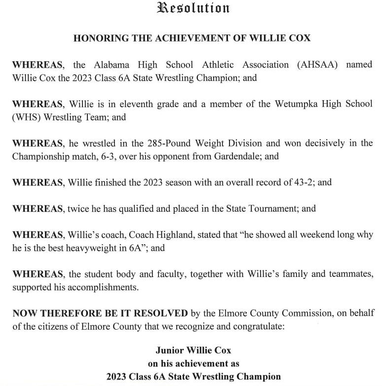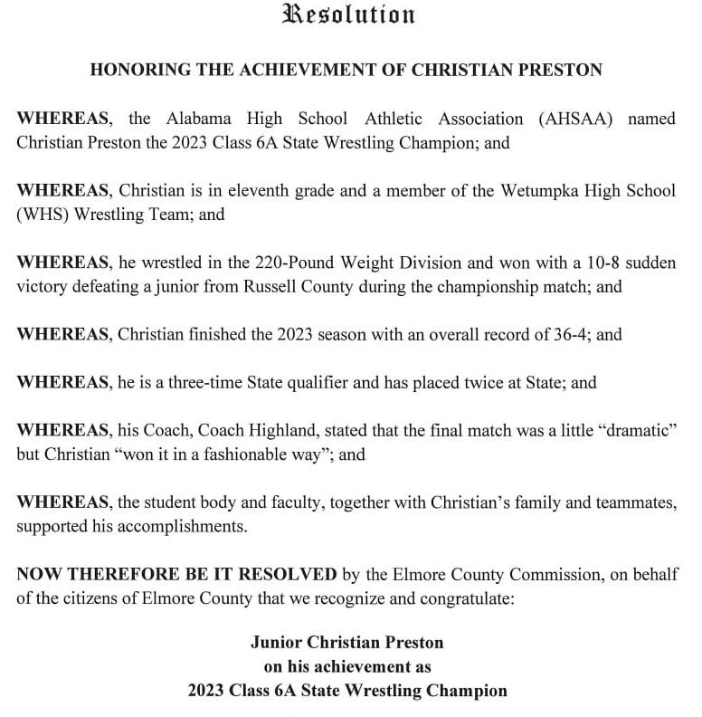 During the April 24th Commission Meeting, the Elmore County Commission approved a resolution honoring the accomplishments of Willie Cox as the 2023 Alabama High School Athletic Association (AHSAA) Class 6A State Wrestling Champion in the 285-Pound Weight Division and Christian Preston as the 2023 AHSAA Class 6A State Wrestling Champion in the 220-Pound Weight Division.
