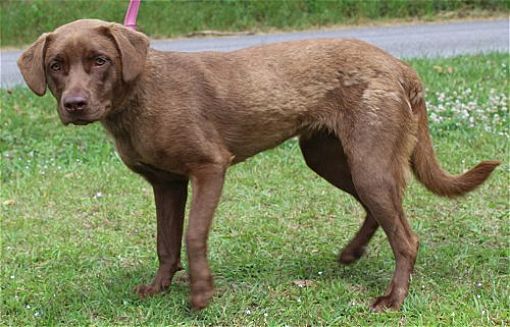 Riley is an 11-month-old female Chesapeake Retriever/Chocolate Lab mix who has already been spayed. She is absolutely gorgeous with her thick, rich chocolate coat and her almond eyes. Riley currently weighs 41 pounds so she is a medium sized adult dog. She is house trained and leash trained. Riley is very well behaved and will make some lucky adopter a wonderful family dog.
