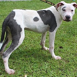 Spot is an 8-month-old male American Pit Bull who has already been neutered. He is white with black markings and weighs about 40 pounds. Spot was brought to PAHS with skin issues and he was underweight. He has been treated for his skin condition and is gaining weight. Spot is a very sweet boy who loves playing with his canine friends. He is frisky, playful, and very easy going. Spot calms down quickly with play time outside in a securely fenced yard. He is leash trained, house trained, crate trained, and knows the commands ‘sit/shake’. Spot has a rough start in life; and in spite of that, he is a loving and good boy!